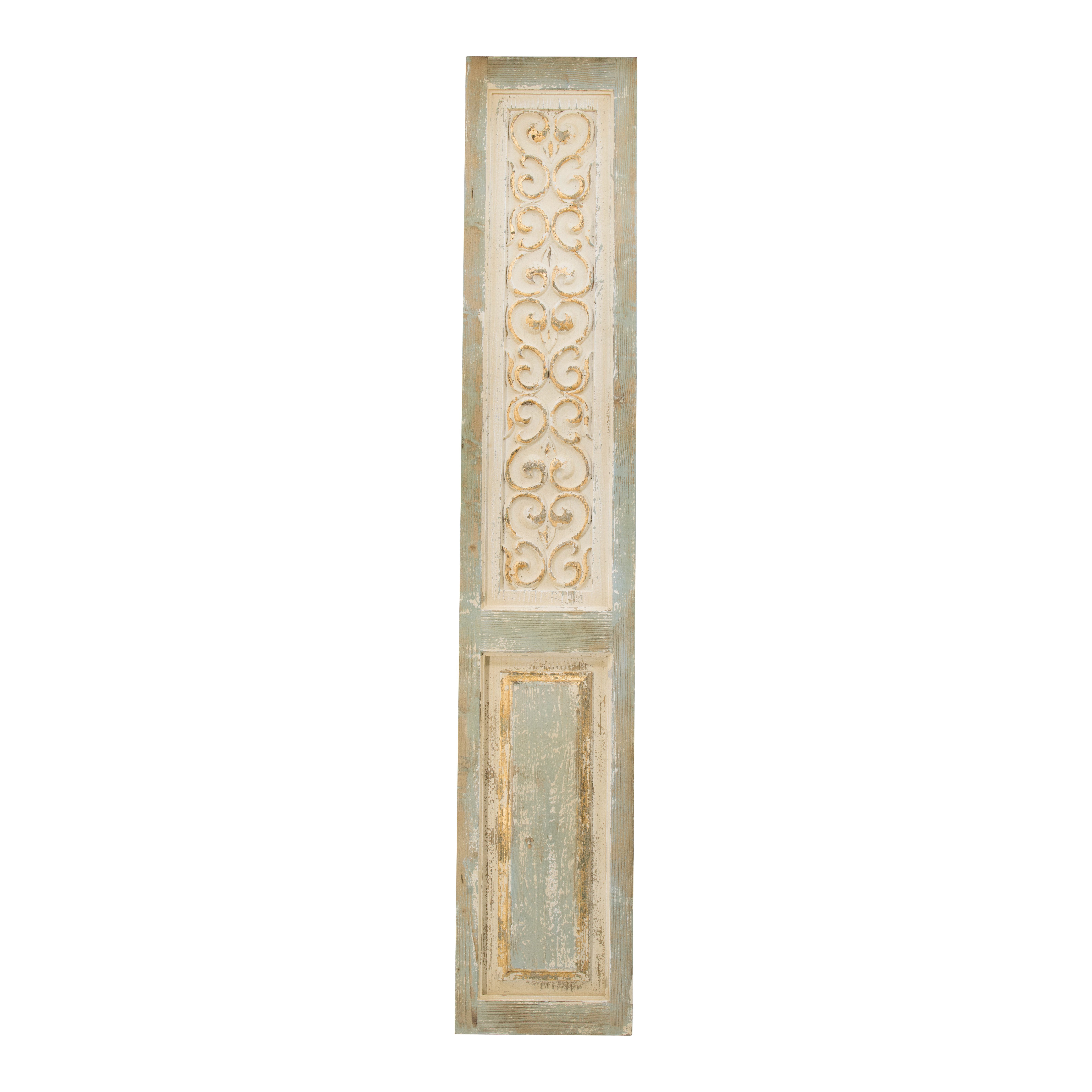 Perfect for decorative large wall spaces, this decorative wood panel features intricate scroll detail in a washed white and light blue finish. Classic design offers your home a traditional touch.