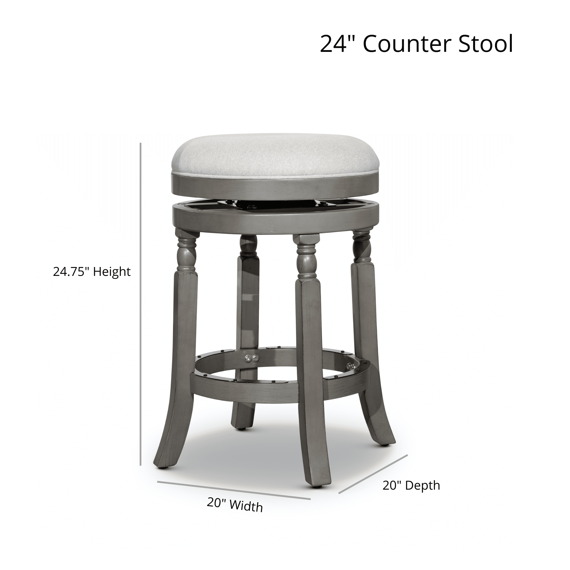 24" Counter Stool, Weathered Gray, Charcoal FabricThe Palmer Lake bar stool brings together traditional elements and a modern style. Crafted from solid hardwood this stool features a spindle turned leg that is flared for stability, metal plated footrests for durability and a 360-degree swivel for mobility. It comes in a modern white, weathered gray, cherry or natural finish and your choice of a bonded leather seat or upholstered fabric seat.
