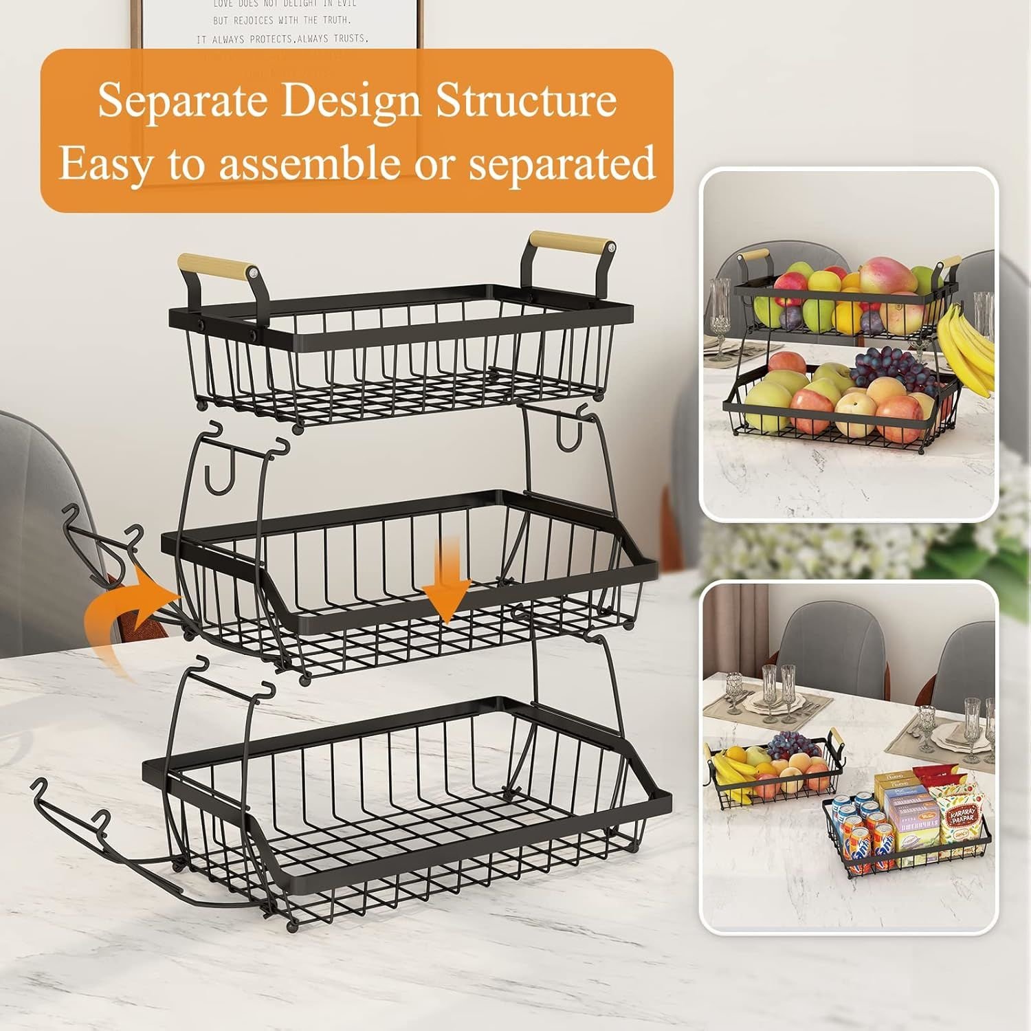 3 Tier Fruit Basket Bowl Farmhouse with Side hooks for Kitchen Countertop, Detachable Metal Bread Fruit Vegetable Storage Basket Stand Holder with Woo