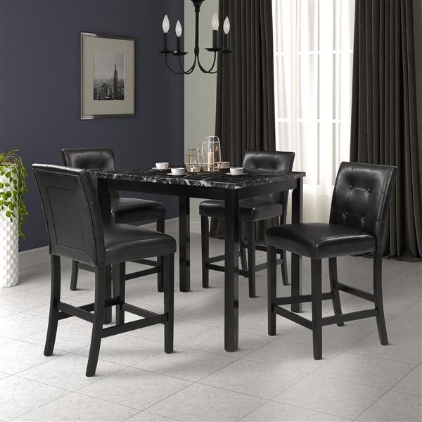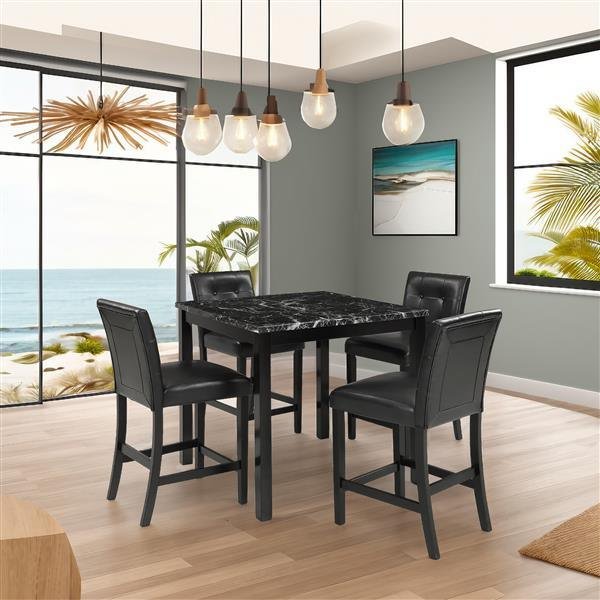 5-Piece Kitchen Table Set Faux Marble Top Counter Height Dining Table Set with 4 PU Leather-Upholstered Chairs, Black