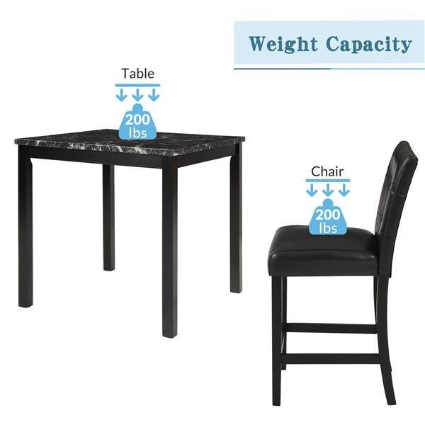 SpecificationFinish: PaintingPackage Cartons: 1 pcProduct Load-bearing: 66lbsCountry of Original: ChinaPacking details: Brown carton with 6 sides foam protect inside. Our product has passed the dropping test according to international standard.[Elegance and Modern Style] Say goodbye to stylistic mediocrity. This 5-Piece dining set adds a modern twist with a distinctively glossy appearance and a marbleized wooden tabletop.[Solid Construction&Durable] The rubber wood frame provides the sturdiness to hold up to 25 lbs, while the Pu leather seat cover requires very little maintenance for everyday use.[Comfort Experience] Both the seat cushion and the back of this black wooden dining set are padded in highly elastic sponge and tufted PU leather upholstery, it also feature footrests for upgraded comfort.[Wide Range of Uses] Anyone can enjoy meals and leisure time with this dining set. Place them in your dining room or eat-in kitchen for maximum convenience.[Dimensions] 1 x Counter Height Dining Table: 35" L x 35" W x 35.8" H; 4 x Counter Height Dining Chairs: 18.5" L x 16" W x 4 " H. 2 boxes in total which may not come together.