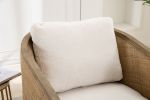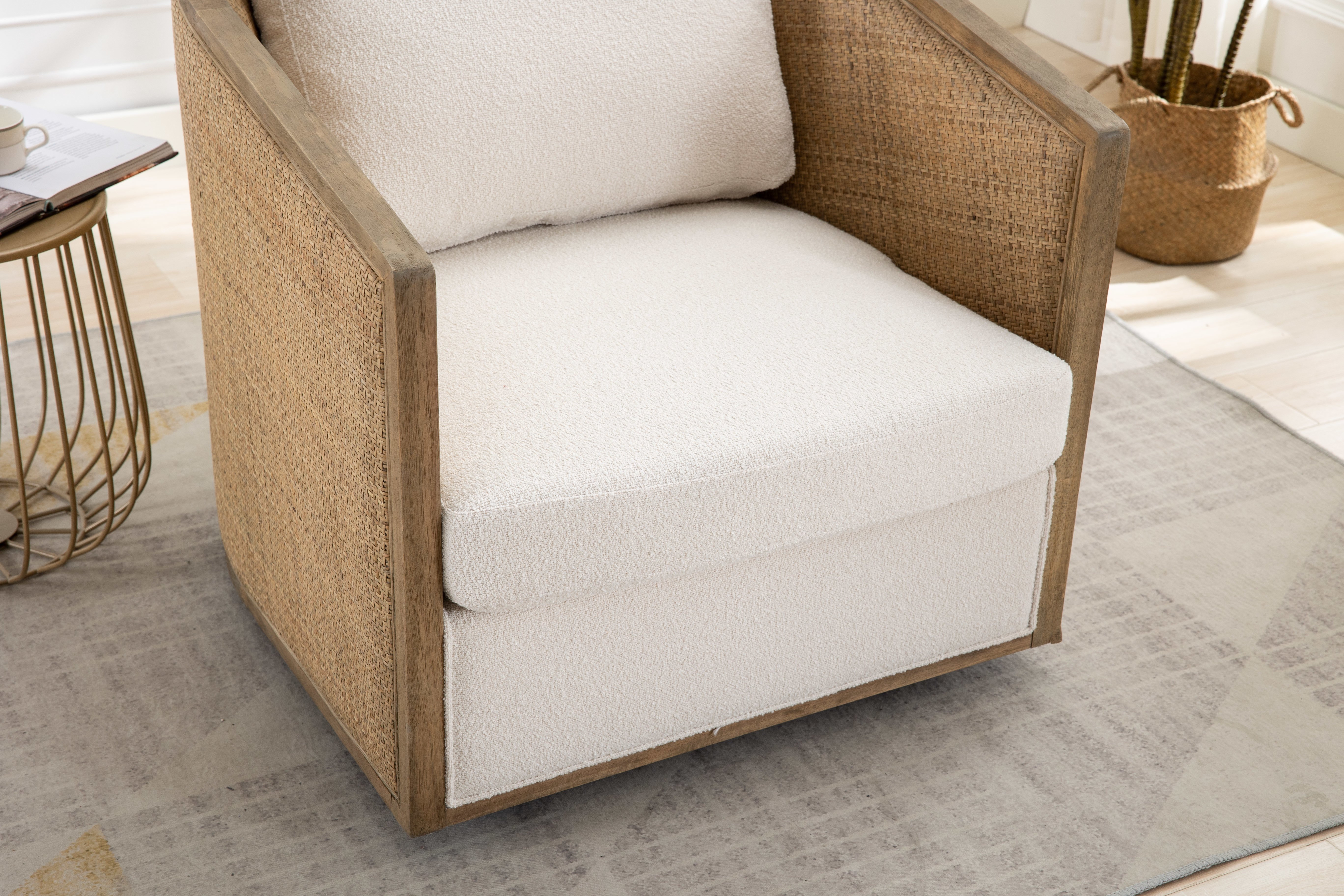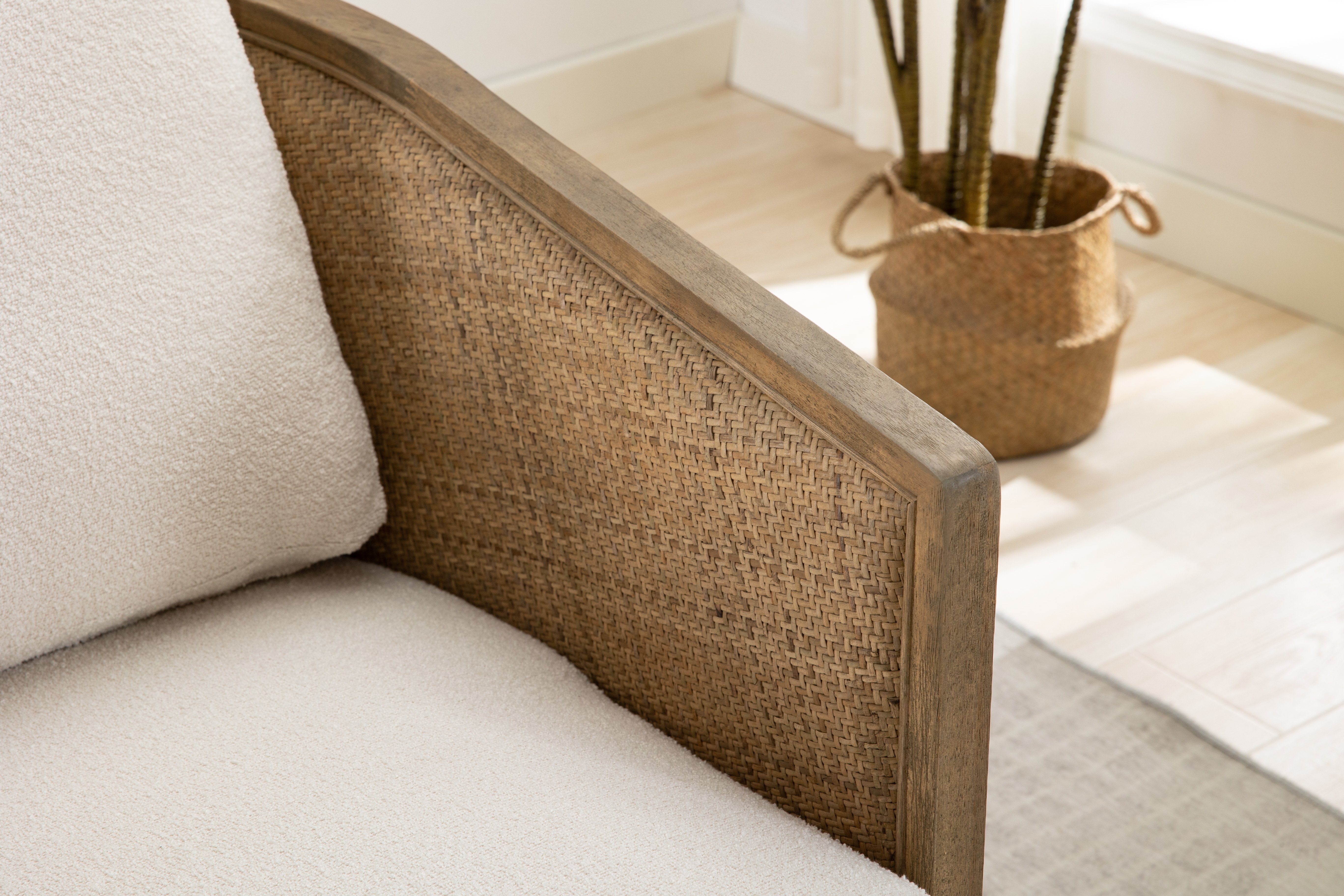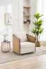 The accent chair features rattan wrapped around the frame of the chair for a unique charm to enhance your decor, featuring elegant rattan details that add a touch of sophistication to any room.