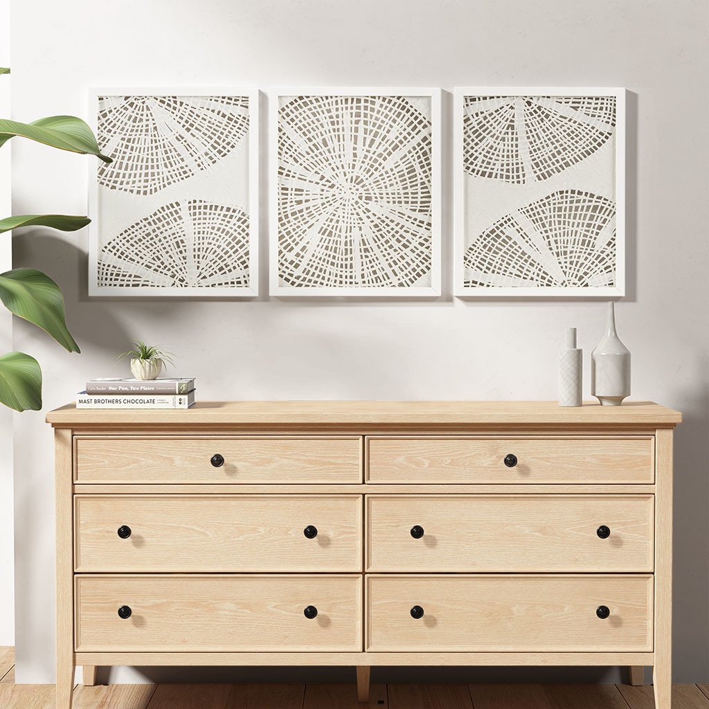 For a subtle coastal touch, the Madison Park Solana Framed Abstract Coastal Rice Paper 3-piece Shadowbox Wall Decor Set is the perfect addition to any decor. Each shadow box features an abstract costal motif made out of handmade rice paper in an off white tone, for a natural and unique design. Finished under glass with a white frame detailing for a gallery look and feel, each piece also features 2 D-rings on the reverse making this 3 Piece set easy to hang in any space. Simply hang this set together for a large focus wall decor or hang pieces separately to fit any space and tie a room together. Spot clean only.