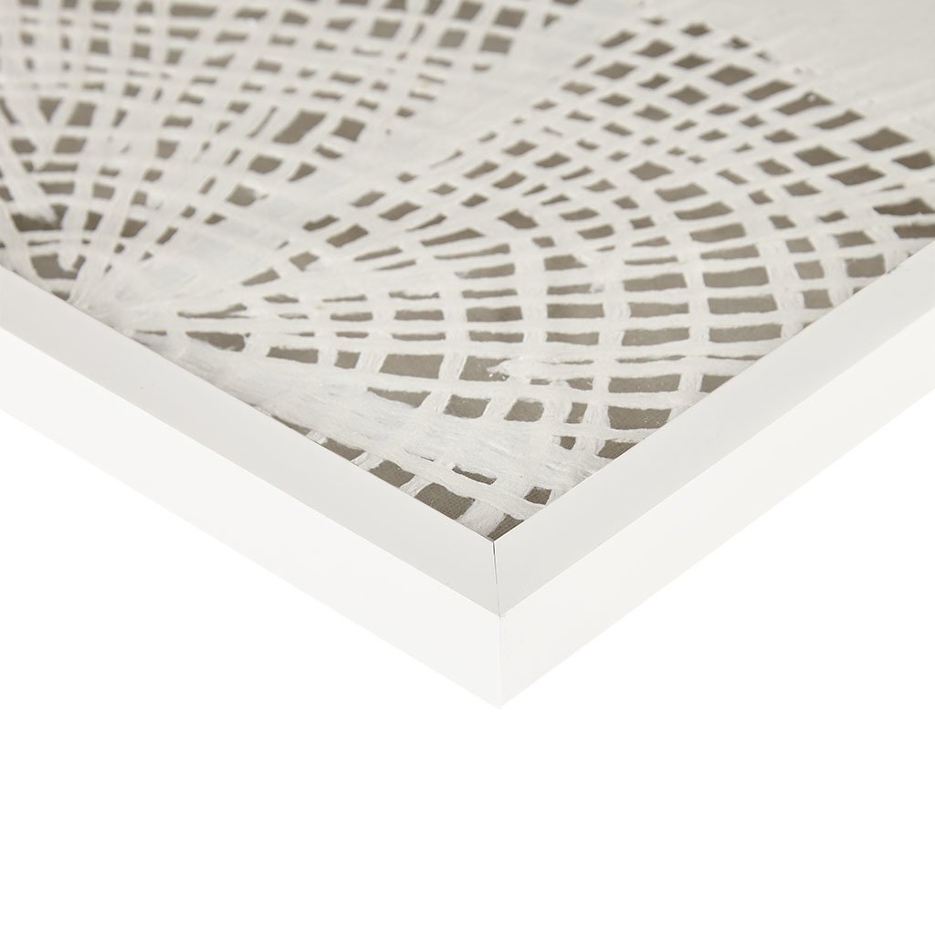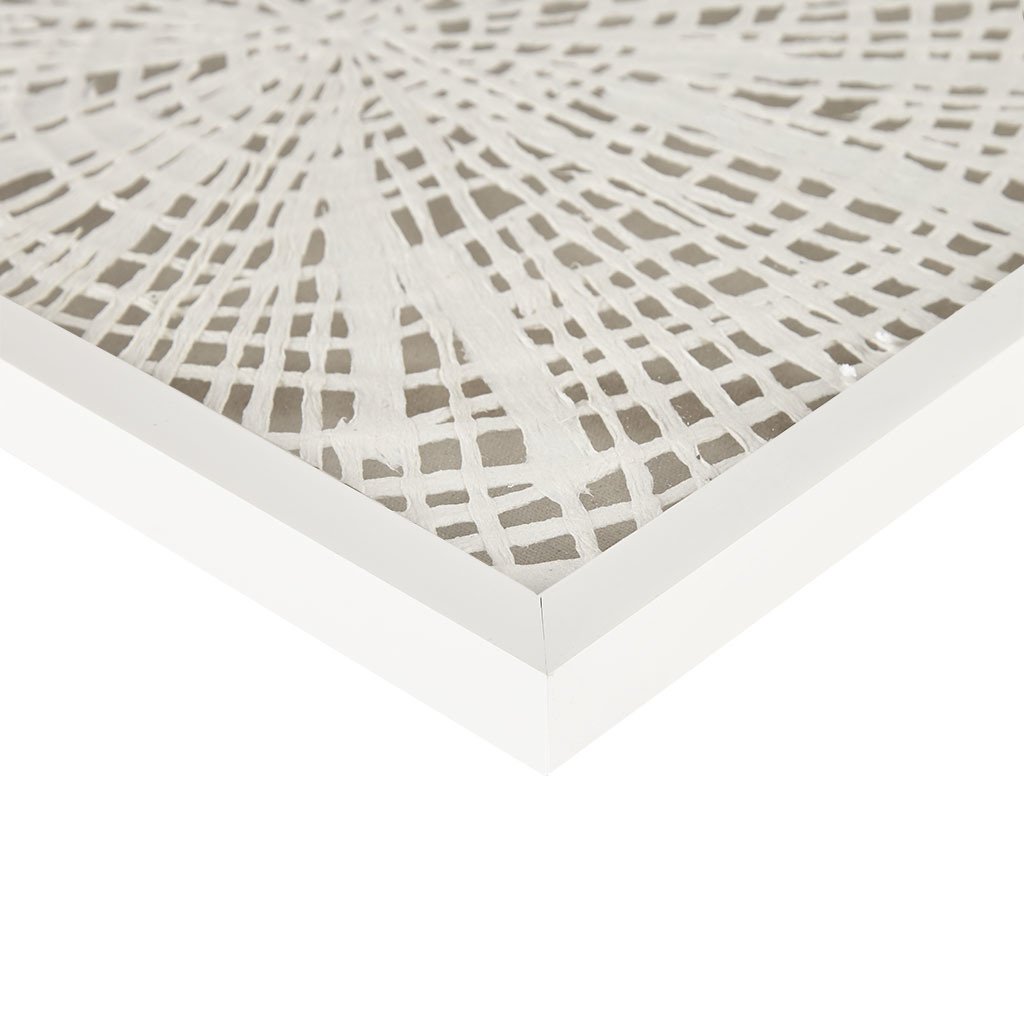 Contrasted against a soft linen and protected by glass and white shadow box frame