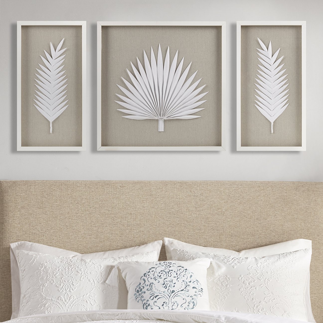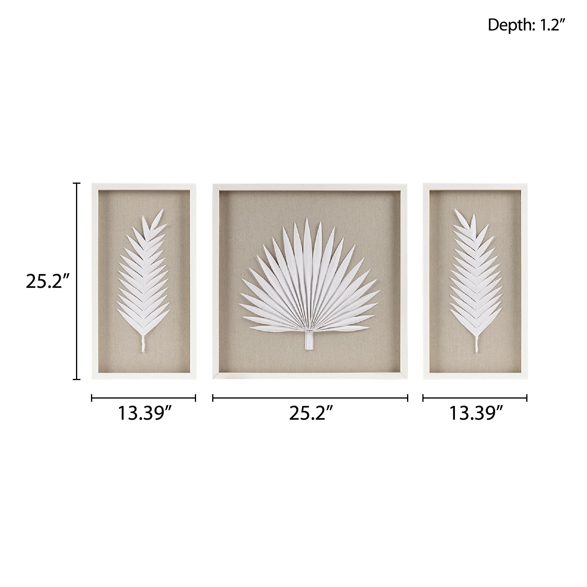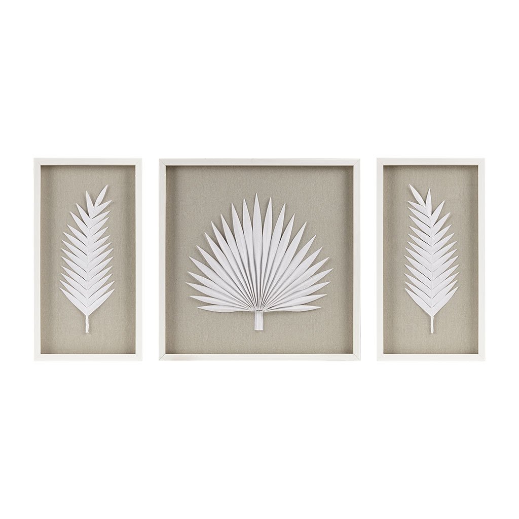 Refresh your space with the coastal elegance of the Madison Park Sabal Framed Rice Paper Palm Leaves 3-piece Shadowbox Wall Decor Set. Each shadow box features a handmade, rice paper palm on a soft linen ground for a naturally modern and unique botanical design. Placed under glass and finished with a white frame for an elevated, gallery look and feel. 2 D-rings on the reverse of each piece makes this 3 Piece set easy to hang in any living room, entryway, or bedroom; Hang this set together for a large focus wall decor or hang pieces separately to fit any space and tie a room together. Spot clean only.