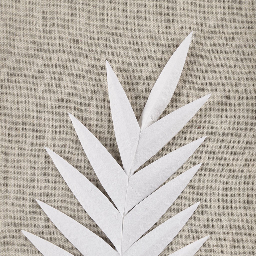Off white rice paper palms contrasted against a soft linen and protected by glass and white shadow box frame