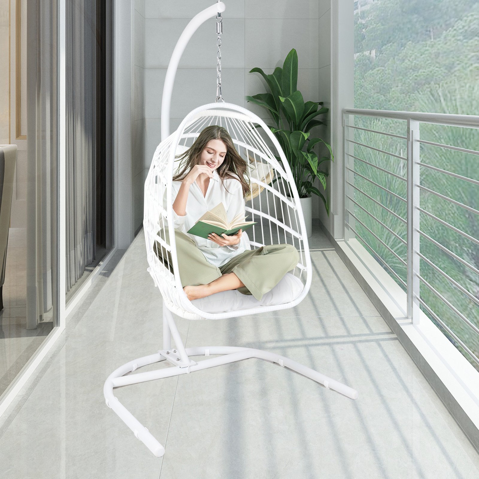 4.Outdoor and indoor use: This egg swing chair is designed to be used inside or outside; Stand and chair combo makes it easy to add a stylish seat to an apartment without having to permanently install it into the ceiling; Makes a wonderful addition to the patio, deck, garden, yard, backyard, porch, bedroom, living room and other places around your home