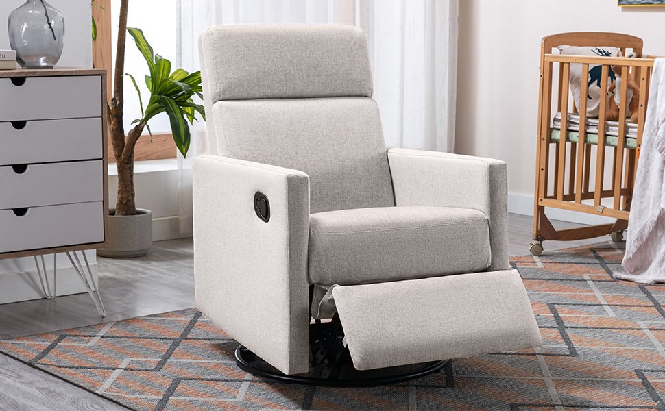 COMFORTABLE & STURDY:This swivel recliner is composed of comfortable and soft fabrics with high-density soft foam padded seat and back, which perfectly wraps your body and brings you the ultimate comfort. Sturdy metal construction with a swivel base and solid wood frame ensures the recliner chair can hold more weight, and durable enough to function properly for years.