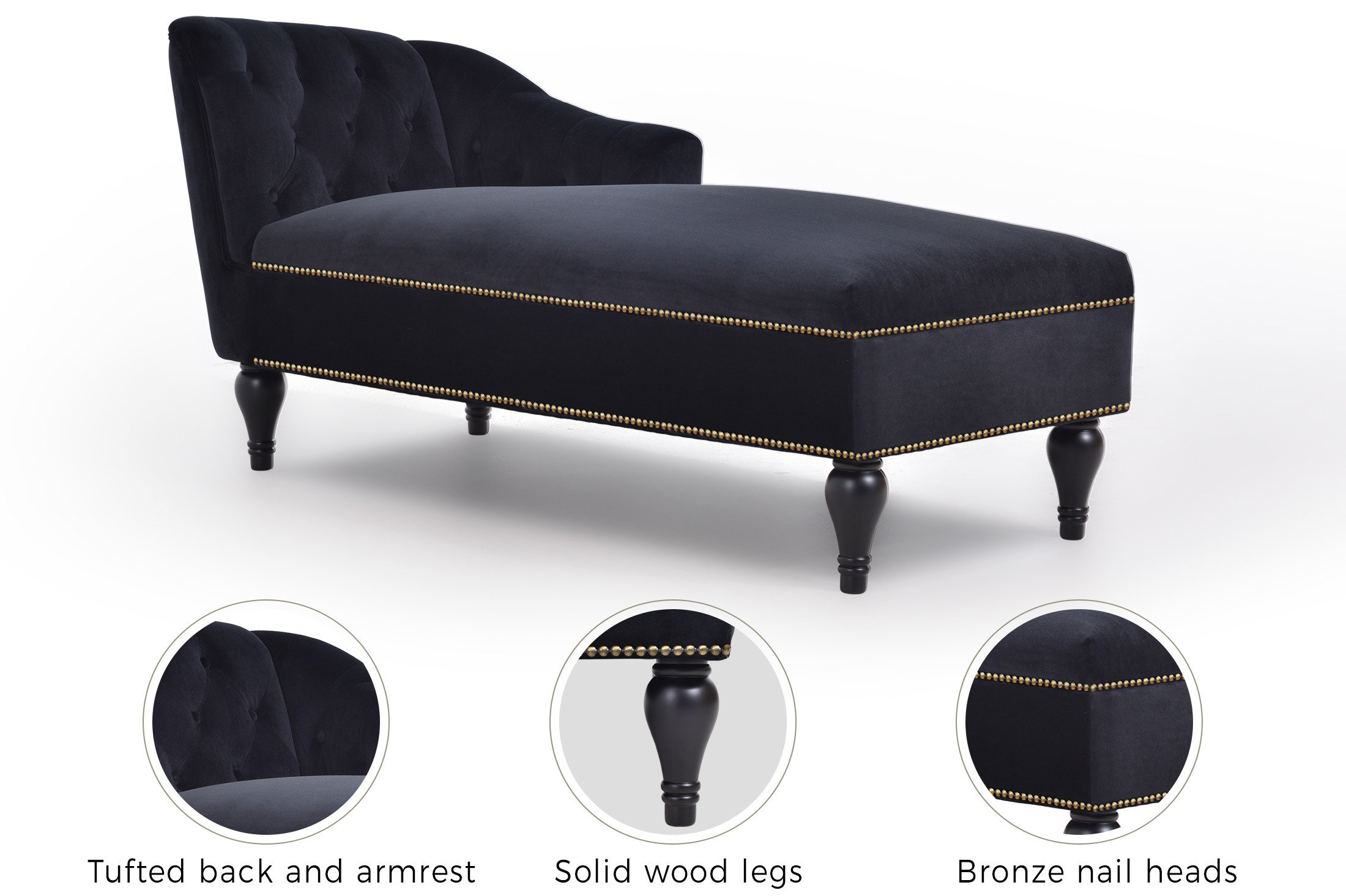 Product TypeChaise LoungeUpholstery Material DetailsVelvetFrame MaterialSolid + Manufactured WoodLeg MaterialSolid WoodSeat Fill MaterialFoamBack Fill MaterialPolyesterProduct CareDust regularly. Clean gently with a clean, slightly damp cloth. Professional cleaning is recommended. Avoid direct sunlight. Never apply or clean with harsh chemicals.Arms IncludedYesNumber of Arms1 ArmArm TypeTufted ArmSeat StyleSingle Cushion SeatBack TypeTufted BackStorage IncludedNoSupplier Intended and Approved UseResidential UseCountry of OriginVietnamAdult Assembly RequiredYesSuggested of People2Additional Tools RequiredTool Free Assembly