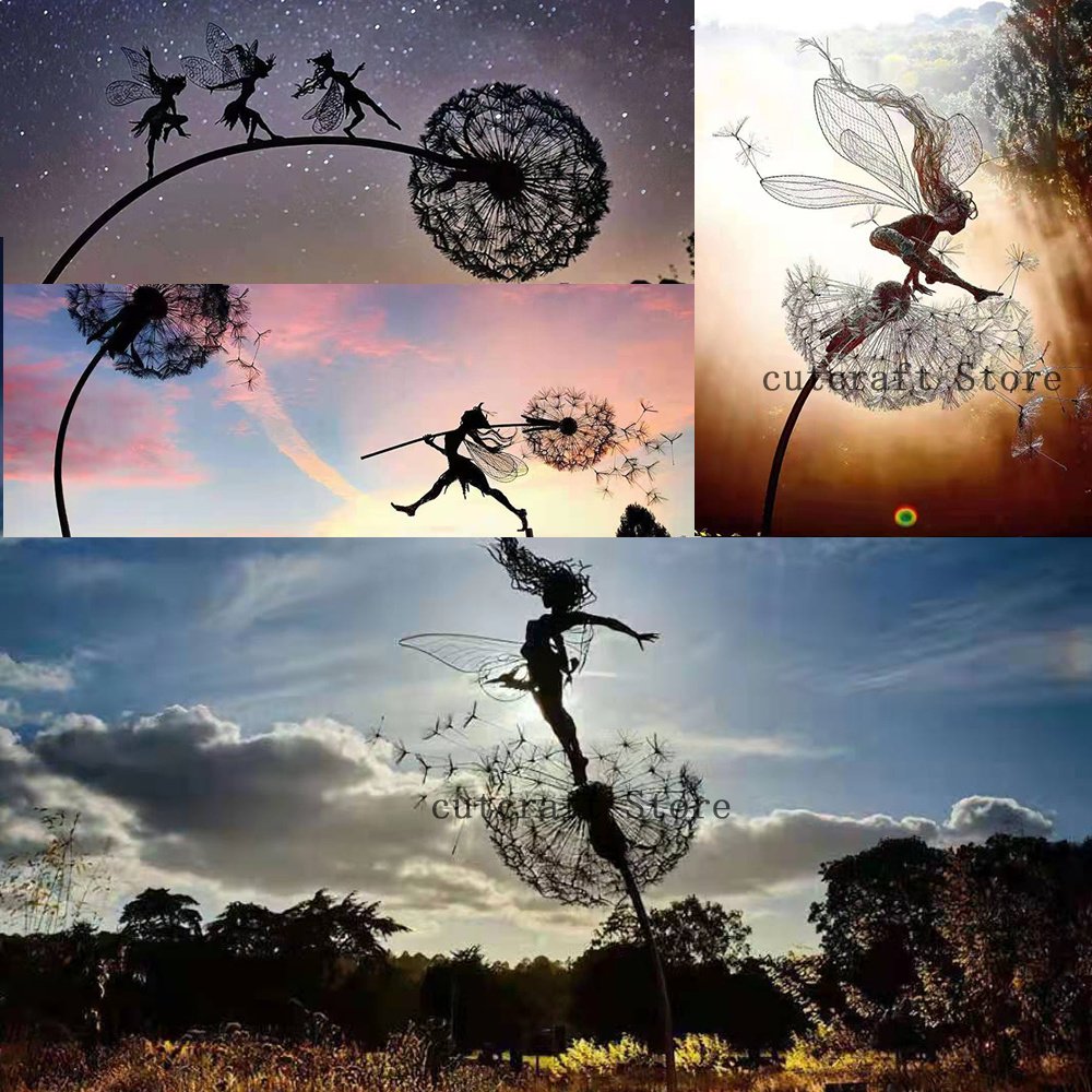 Dandelion Figurine Fairies Pixies Dancing Fairy Statue Steel Wires Fairy Garden Miniature Sculpture Mythical Garden Yard Decor