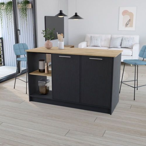 Meet the Kitchen Island Padua, where culinary finesse meets stylish functionality. Crafted with the modern chef in mind, it showcases a generous 59" W x 25.1" D countertop, making meal prepping a delight or even moonlighting as a chic dining table. Dual open storage shelves, each measuring 14.8"H x 17.2"W, keep ingredients or utensils within easy reach. Complementing this is a double-door cabinet, thoughtfully designed with inner shelves to tuck away cookware or groceries. All are elegantly framed in durable white/light oak, black/macadamia, black/onyx or white/onyx manufactured wood finishes.Dimensions:Height: 35,4" Width: 59'Depth: 25,1'Furniture Type: Ready to assemble (full assembly required).Certifications: CARB phase II compliant – TSCA Title VI Compliant.Warranty: 1-year warranty coverage in wooden parts- 1-year warranty coverage in hardware pieces since its manufacturing date found in the lot number printed in the product box.