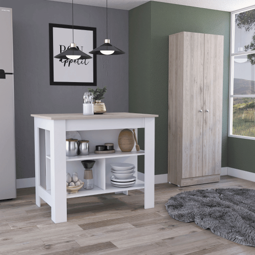 Ontario 2 Piece Kitchen Set, Kitchen Island + Pantry Cabinet , White /Light Gray