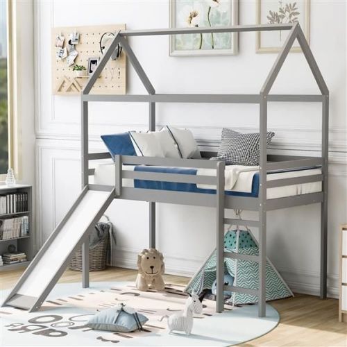Home > Twin Loft Bed with Slide, House Bed with Slide,Gray