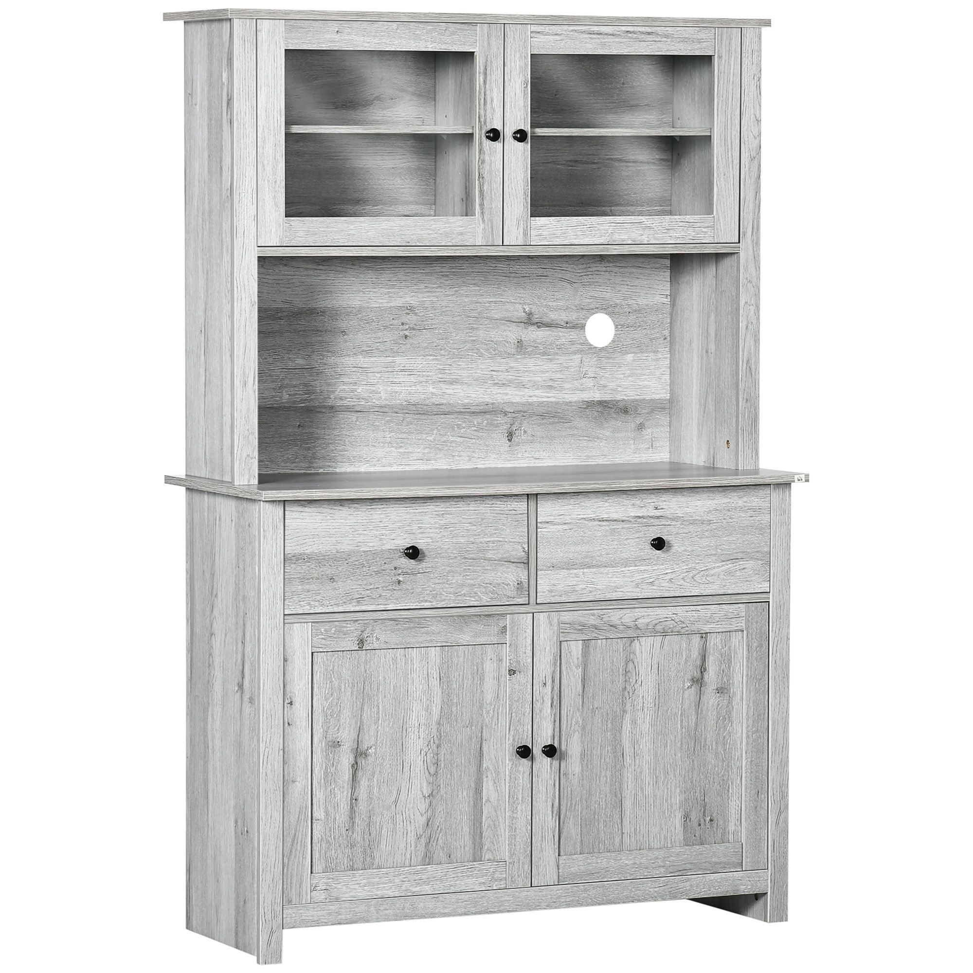 63.5" Kitchen Buffet with Hutch, Pantry Storage Cabinet with 4 Shelves, Drawers, Framed Glass Doors, Open Microwave Countertop, Ash Grey