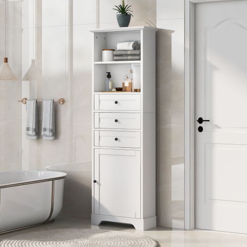 3.Wide Application: Not only focusing on functionality, the design of this tall storage cabinet is also simple and elegant. The details such as decorative top, arc base, groove pattern etc., reveal graceful temperament. It is suitable for various environment, for instance, bathroom, kitchen, dining room, living room, or study.
