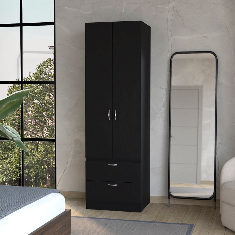 Upgrade your bedroom with the elegant Armoire Marlton, which offers ample storage and style. Crafted from high-quality black manufactured wood, this armoire features a spacious storage cabinet (21.1"W X 36.1"H X 18"D) with a clothing rod for hanging garments and an interior shelf (11.8"H) for folded clothes or accessories. Additionally, the armoire includes two exterior drawers (19.9"W x 3.3"H x 13.2"D), perfect for organizing smaller items. . Dimensions: Height: 76.8'Width: 23.3' Depth: 19.5'Furniture Type: Ready to assemble (full assembly required).Certifications: CARB phase II compliant – TSCA Title VI Compliant.Warranty: 1-year warranty coverage in wooden parts- 1-year warranty coverage in hardware pieces since its manufacturing date is found in the lot number printed in the product box.Shipment details: Free shipping to the 48 contiguous states - delivery time: Between 2 and 5 days, depending on the customer's location, season, and weather factors.Other details: This product does not include decorative or background elements; Check that the box is in good condition and well packed and check with the help of the manual that the corresponding parts have been included; For more information regarding warranty, shipment details, cancellations, returns & replacement parts go to the bottom section of our website to learn more; Installation & Assembly Instructions included.