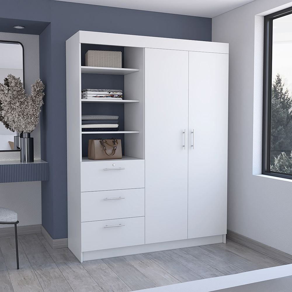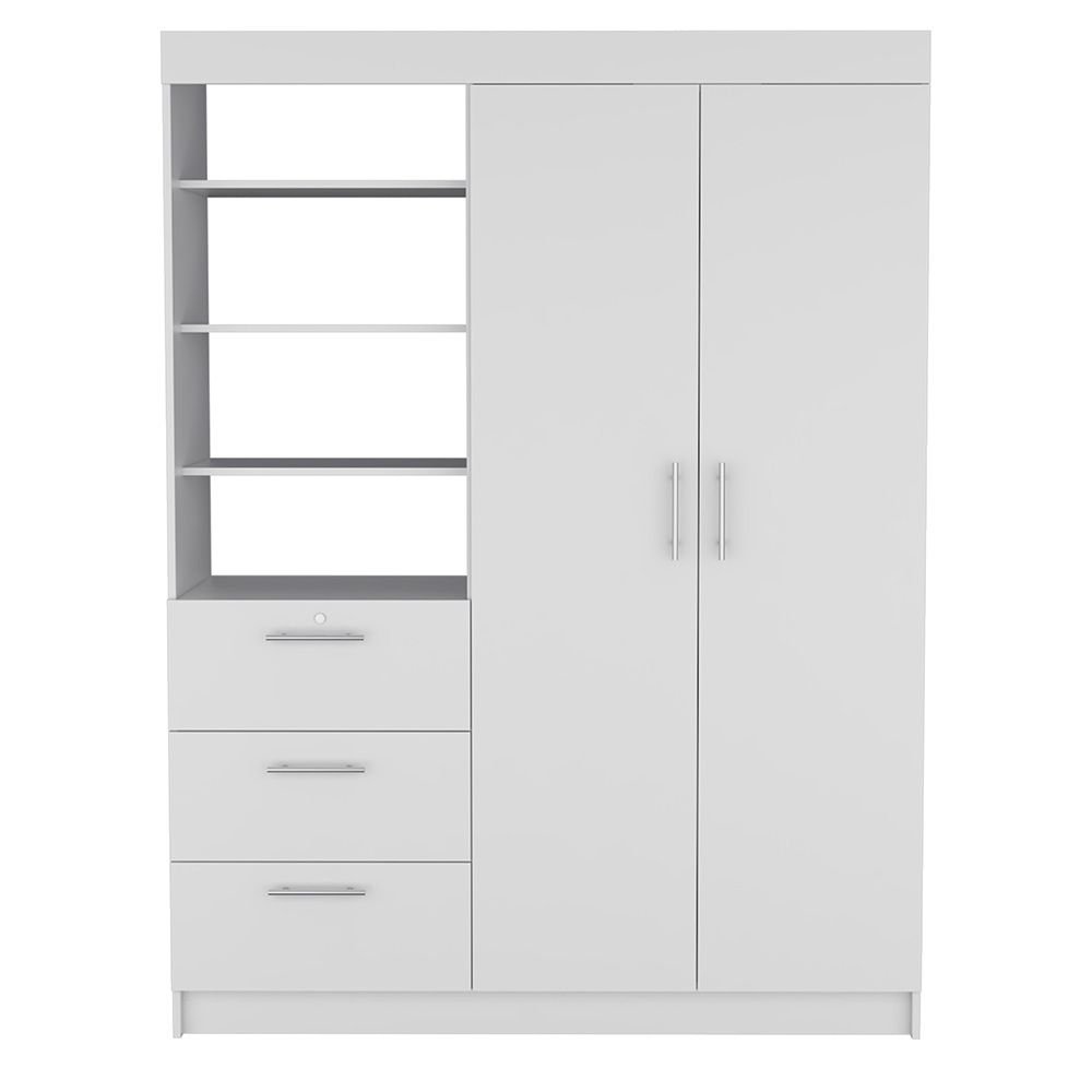 Kenya 3 Drawers Armoire, Double Door, 3-Tier Shelf -White