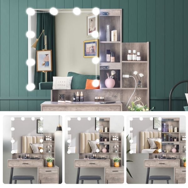 This is a multi-functional dressing table; which is made of high-quality sheet metal; high-quality metal handles; and high-hardness installation accessories; the structural design of 2 drawers; 1 door; 2 shelves and 1 mirror cabinet makes this product The storage space is greatly improved; 3 colors can be adjusted; white light/warm white/warm light; which can be switched at will in different application scenarios; 2 3-hole sockets and 2 USB interface plugs; make this dresser more Intelligent.