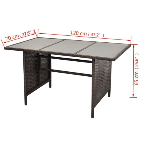 Features:Our elegant, highly comfortable rattan lounge set will become the focal point of your garden or patio. Complete with a dining table and soft cushions and pillows, this patio sofa set is ideal for al fresco dining or for simply relaxing and enjoying the weather. Thanks to the weather-resistant and waterproof PE rattan, the lounge set is easy to clean, hard wearing and suitable for outdoor use. The dining set has a sturdy powder-coated steel frame, which is highly durable. The tempered glass tabletop is sturdy and easy to clean. The sofa set is delivered with comfortable cushions and pillows. The easy-to-clean polyester covers with zips can be removed and washed. This rattan lounge set is lightweight, which makes it easy to move around to suit any setting. Delivery includes 1 L-shaped sofa, 1 table, 2 ottomans, 7 pillows, and 5 cushions. Note 1): We recommend covering the set in the rain, snow and frost.Note 2): This item will be shipped flat packed. Assembly is required; all tools, hardware and instructions are included.Rattan color: BrownCushion & pillow color: Cream whiteMaterial: Powder-coated steel frame + PE rattan + tempered glass tabletopCushion & pillow material: 100% polyesterL-shaped sofa dimensions: 86.6" x 67.7" x 32.3" (W x D x H)Seat depth: 19.7"Seat height from the ground: 13.8"Backrest height: 18.5"Table dimensions: 47.2" x 27.6" x 25.6" (L x W x H)Thickness of tempered glass: 0.2"Ottoman dimensions: 15.7" x 15.7" x 13.8" (L x W x H)Thickness of cushion: 2"Thickness of pillow: 3.9"Delivery includes:1 x L-shaped sofa1 x Table2 x Ottoman7 x Pillow5 x CushionCalifornia Proposition 65WARNING: California's Proposition 65Specifications:Rattan color: BrownCushion & pillow color: Cream whiteMaterial: Powder-coated steel frame + PE rattan + tempered glass tabletopCushion & pillow material: 100% polyesterL-shaped sofa dimensions: 86.6" x 67.7" x 32.3" (W x D x H)Seat depth: 19.7"Seat height from the ground: 13.8"Backrest height: 18.5"Table dimensions: 47.2" x 27.6" x 25.6" (L x W x H)Thickness of tempered glass: 0.2"Ottoman dimensions: 15.7" x 15.7" x 13.8" (L x W x H)Thickness of cushion: 2"Thickness of pillow: 3.9"Delivery includes:1 x L-shaped sofa1 x Table2 x Ottoman7 x Pillow5 x CushionCalifornia Proposition 65WARNING: California's Proposition 65