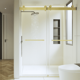56-60 inches W *76 inches H Frameless Double Sliding Soft-Close Shower Door in Brushed Gold,3/8 inches (10mm) Thick SGCC Tempered Glass Door