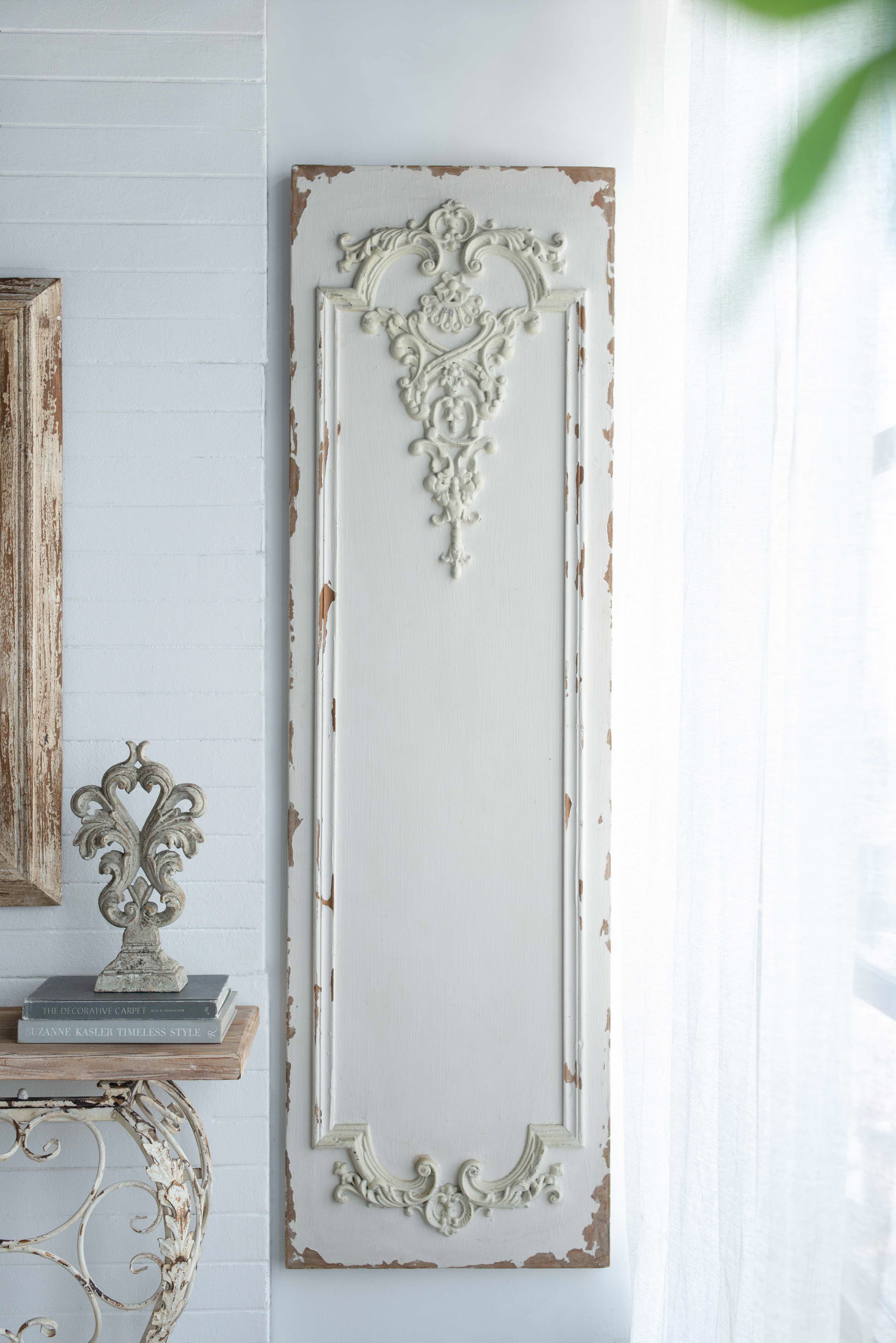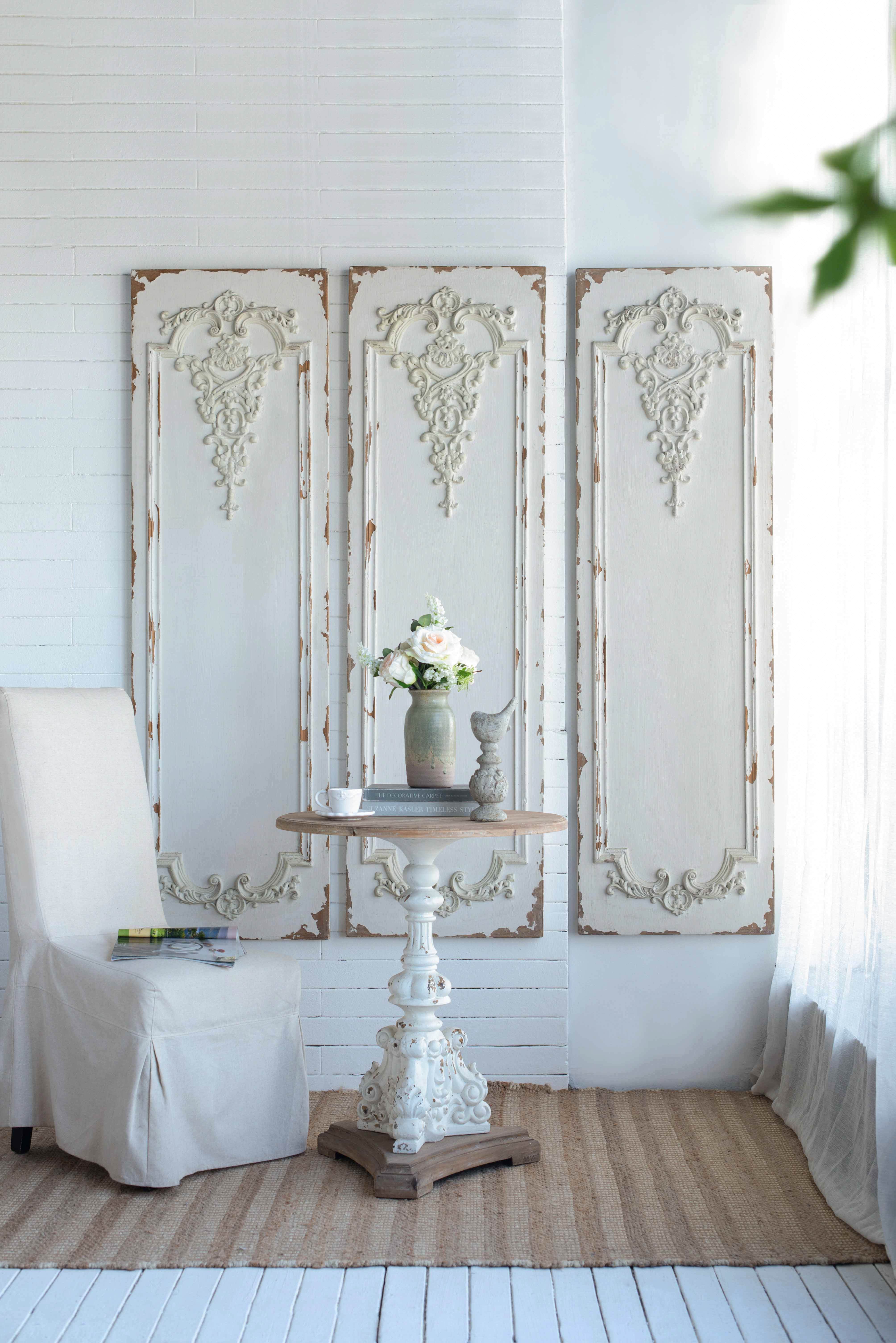 Inspired by ornate boiserie designs, this trio of Alcott Wall Panels instantly enhances the elegance of any space. A simple white finish gives way to a weathered textural effect, giving a timeworn appearance that makes each individual panel one-of-a-kind. Experiment with spacing to find the arrangement that best works for your space.