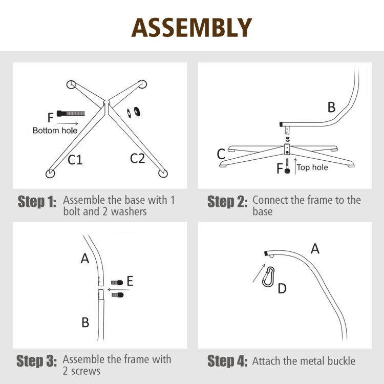 Designed with a C frame style; the hammock stand provides you 360 degrees of hanging freedom. Constructed of sturdy tubular steel with black powder coated; the stand is strong and durable for years of use. The X base takes up little space yet offers great balance. It’s easy to assemble.